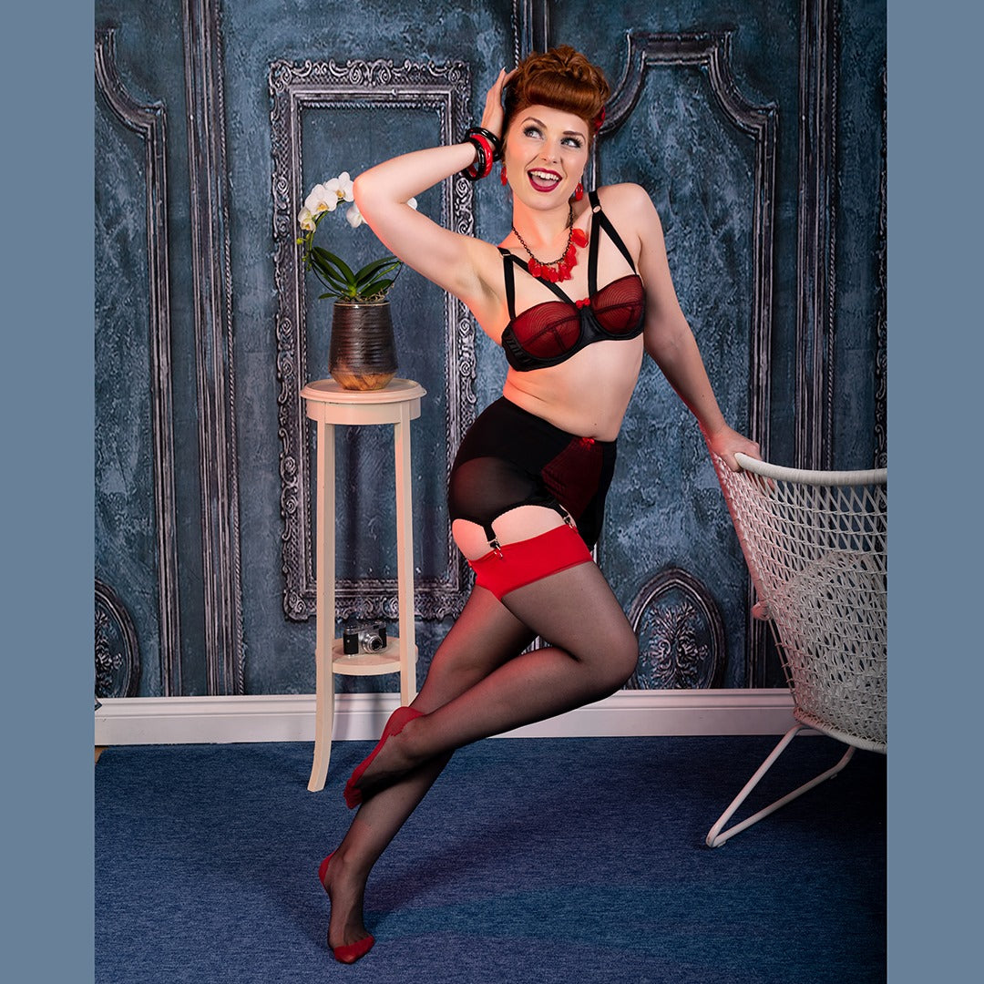 A playful twist on a classic, our Black with red Seamed Stockings bring colour and character to the timeless glamour of vintage hosiery. With a sheer champagne leg and red seam, these stockings are a modern favourite with authentic retro charm. First introduced in 2012, they’ve since become a go-to for those seeking a nautical accent.